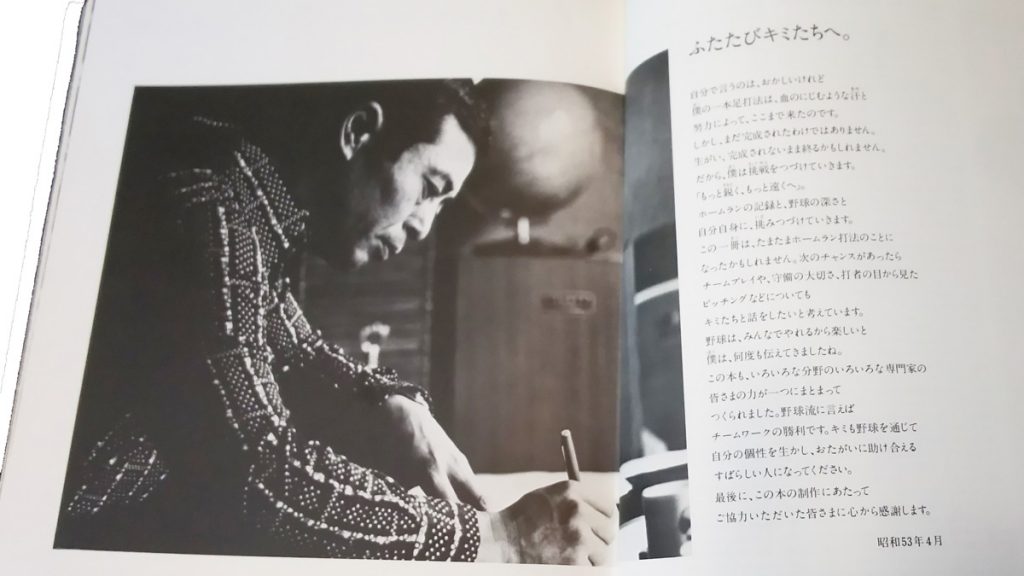 王さんの子供たちへの熱い思いはこの一冊に込められている。王さんは146ページにわたり、心構え、バッティングの理論、ご自分の生い立ち、少年時代から巨人入団までのエピソード、一本足打法の完成まで、そして思い出のホームランストーリーなどを語った。現役の大打者、当時、ホームラン記録の世界一を目指す王さんが書いた、素晴らしい本だ。